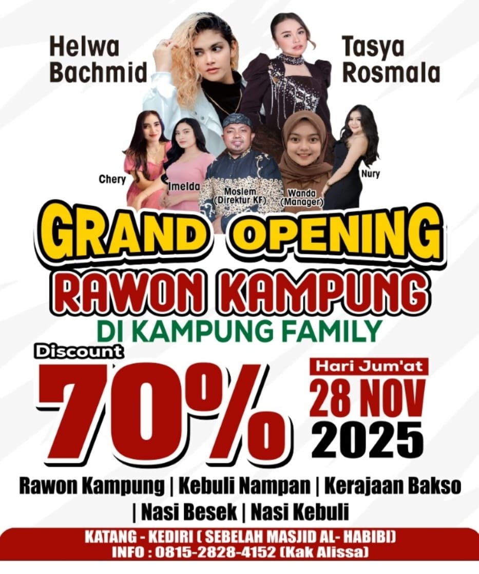 Kediri – Sebagai pemilik dari Kampung Famili yang berada di Katang Kediri (sebelah mesjid Al Habibi), Cak Ofi memberi ‘kejutan’ saat Grand Opening pada 28 November 2025. Salah satubya membawa Helwa Bachmid yang kini sebagai brand ambasador Kampung Family.