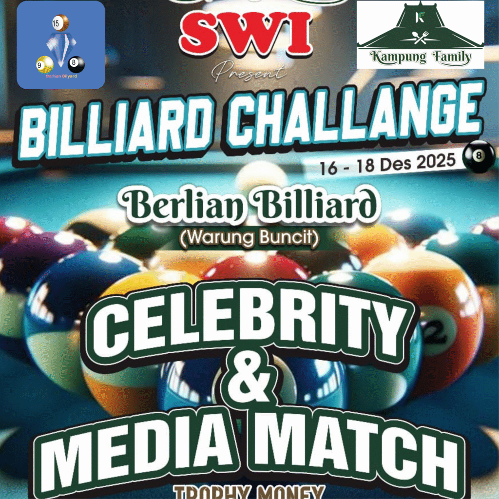 Jakarta – Sebagai lokasi Billiard yang sudah tersohor sejak lama, Berlian Billiard berbagi kebahagiaan dengan Suara Wartawan Indonesia (SWI), sebagai penyelenggara Tournament Billiard antara artis dan wartawan. Seperti dikatakan H. Nur selaku pemilik dan pengelola Berlian Billiard, berharap dengan kegiatan ini kembali menggairahkan olahraga Billiard.