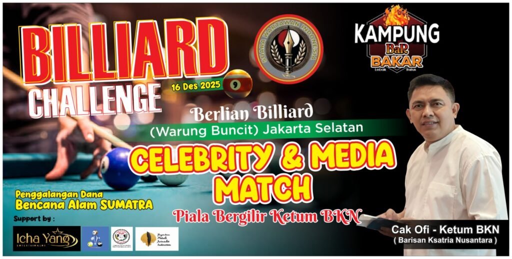 Jakarta – Suara Wartawan Indonesia (SWI) kembali menggelar kegiatan. Di penghujung tahun ini, diadakan pertandingan Tournament Billiard, antara artis dan wartawan, dengan dukungan Kampung Bar Barkar sebagai sponsor utama.